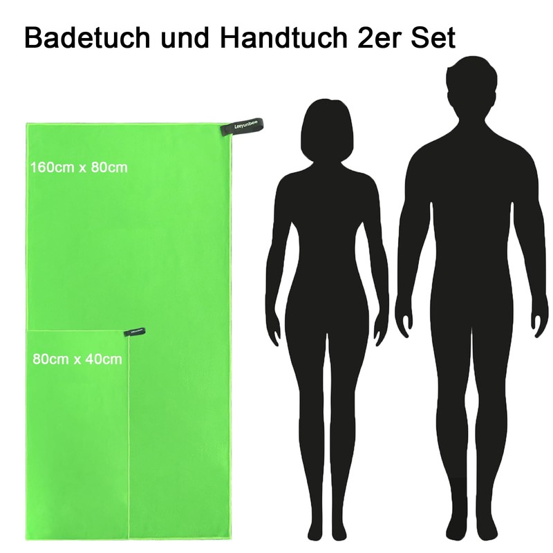 Leeyunbee Microfibre Towel Set of 2 - 160 x 80 cm Bath Towel Large + 80 x 40 cm Small Towel, Quick-Drying Sports Towel, Compact Microfibre Towels, Travel Towel, Beach Towel (Green)
