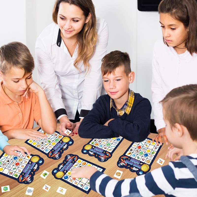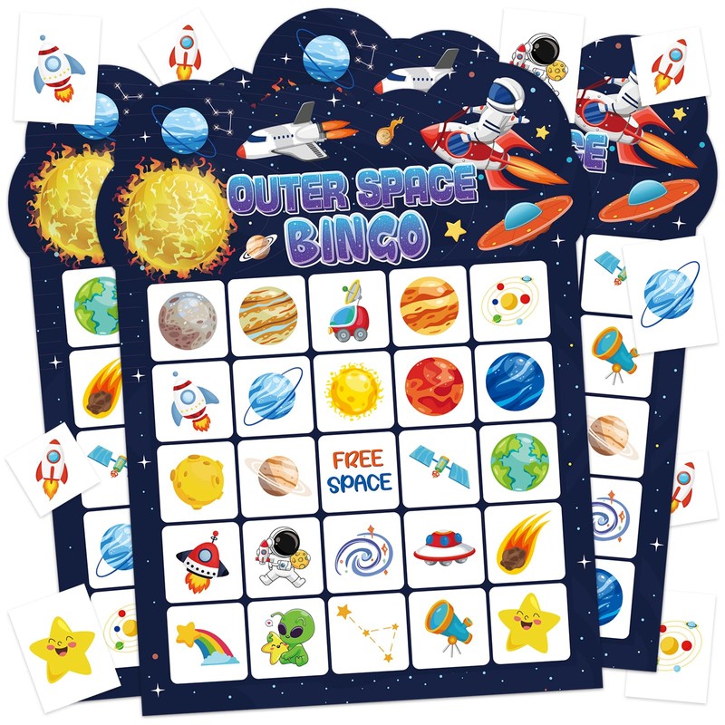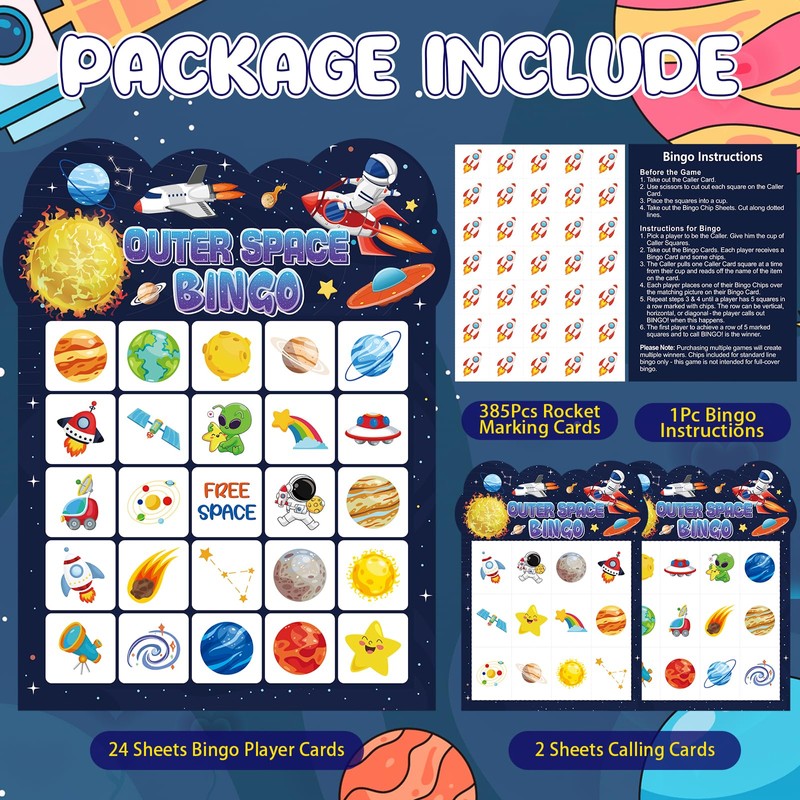 - Solar System Bingo Set: The package includes 24 outer space bingo cards, 385 birthday cake bingo chips and 2 calling cards. This space bingo game is perfect for large groups, which can cater for up to 24 players, and you can enjoy this fun space bingo card game with your family and friends.