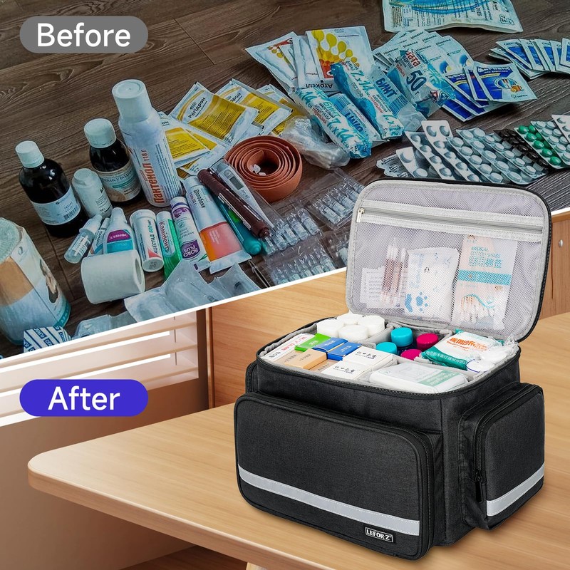 - 【High Quality】Pill Bottle Organizer Size:11.7 x 8 x 8 inch, enough space for you to store daily first aid supplies. The first aid bag is made of tear-resistant and waterproof polyester material, which is strong and durable. It is lightweight and the top handle is perfect to take with you.