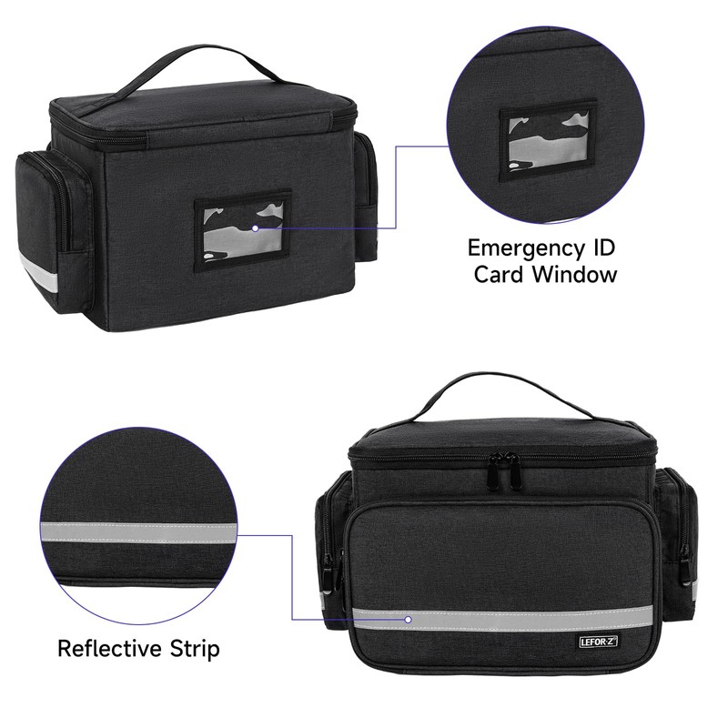 - Unique Design The reflective strip on the front of this first aid bag is great even at night or in bad weather to quickly find our medical device bag when needed. The ID window on the back is specially designed for user identification to easily identify who the bag belongs to and does not make it wrong.