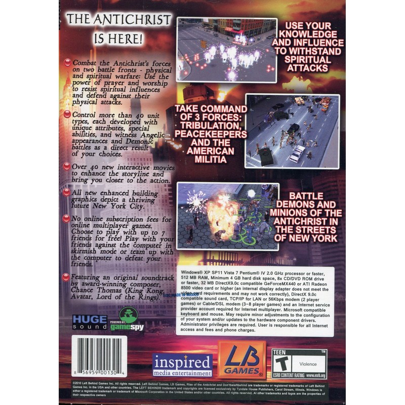 Left Behind 3: Rise of the Antichrist is a real-time strategy game based on the best-selling Left Behind book series, created by Tim LaHaye and Jerry Jenkins. Join the ultimate fight of Good versus Evil, commanding the Tribulation Forces, the Global Community Peacekeepers and the American Militia.