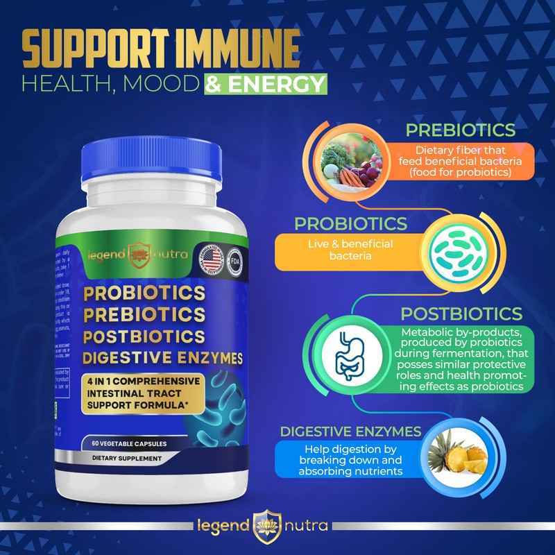 PREBIOTIC PROBIOTIC & POSTBIOTIC COMBINATIONA combination of prebiotics and postbiotic probiotics is beneficial for the digestive system. Each nutrient present in this supplement play several important roles in digestion. Probiotics are good bacteria, while prebiotics are food for these good bacteria. This combination increases the digestive effect. It contains a prebiotic complex which acts as food for the good bacteria.SUPPORTS HEALTHY DIGESTIONBalanced amounts of probiotics and prebiotics can ensure you are getting the right amount of healthy bacteria to support healthy order and digestion. This supplement regularly helps us to rebalance the digestive system and enable you to have a healthy digestion.SAFETY INFORMATIONDo not exceed the recommended dose. Pregnant or nursing mothers, children under the age of 18, and individuals with a known medical condition should consult a physician before using this or any dietary supplement. This product is manufactured and packaged in a facility which may also process milk, soy, wheat, egg, peanuts, tree nuts, fish and crustacean shellfish.Keep out of the reach of children. Contains desiccant packed for freshness. Do not eat packet. Do not use if the safety seal is managed or missing. Store in cool, dry places. FEATURESHelps maintain intestinal comfort.May help with occasional gas or bloating.Made in the USA with non-GMO ingredients.4 in 1 comprehensive intestinal tract support formula.SUGGESTED USE2 capsules taken daily preferable with meals or as directed by a healthcare professional. For best results, take 1 capsule with lunch and 1 capsule with dinner.SPECIFICATIONBrand: Legend NutraIngredients: NaturalCapsule Count: 60