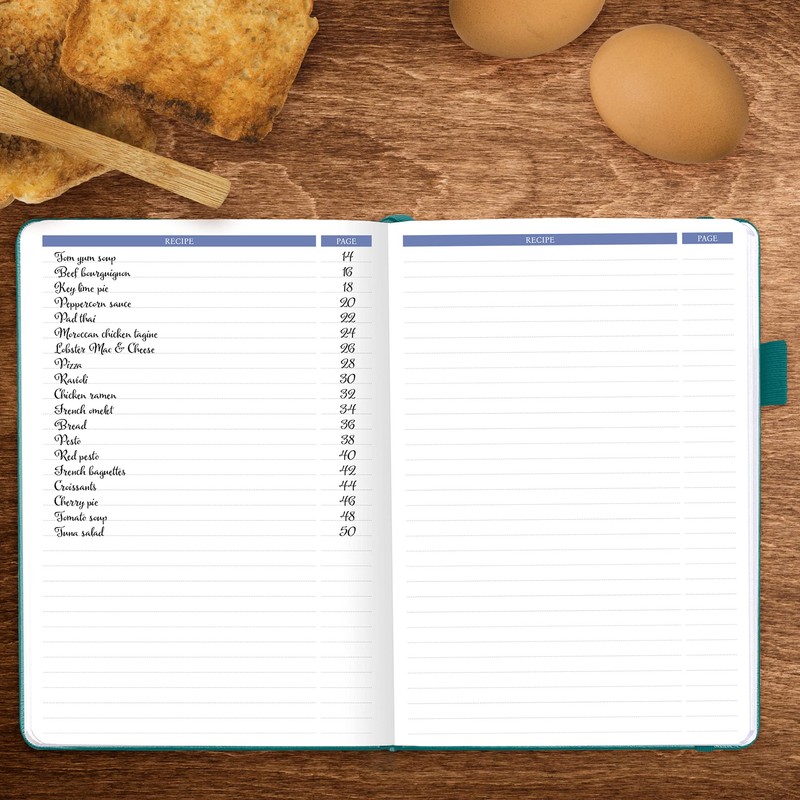 • DESIGNED FOR EASY USE IN THE KITCHEN - This personalized recipe book journal has a washable eco-leather hardcover, 120gsm no-bleed paper, lay-flat binding, elastic, pen loop, pocket for loose recipes, and 3 ribbon bookmarks.