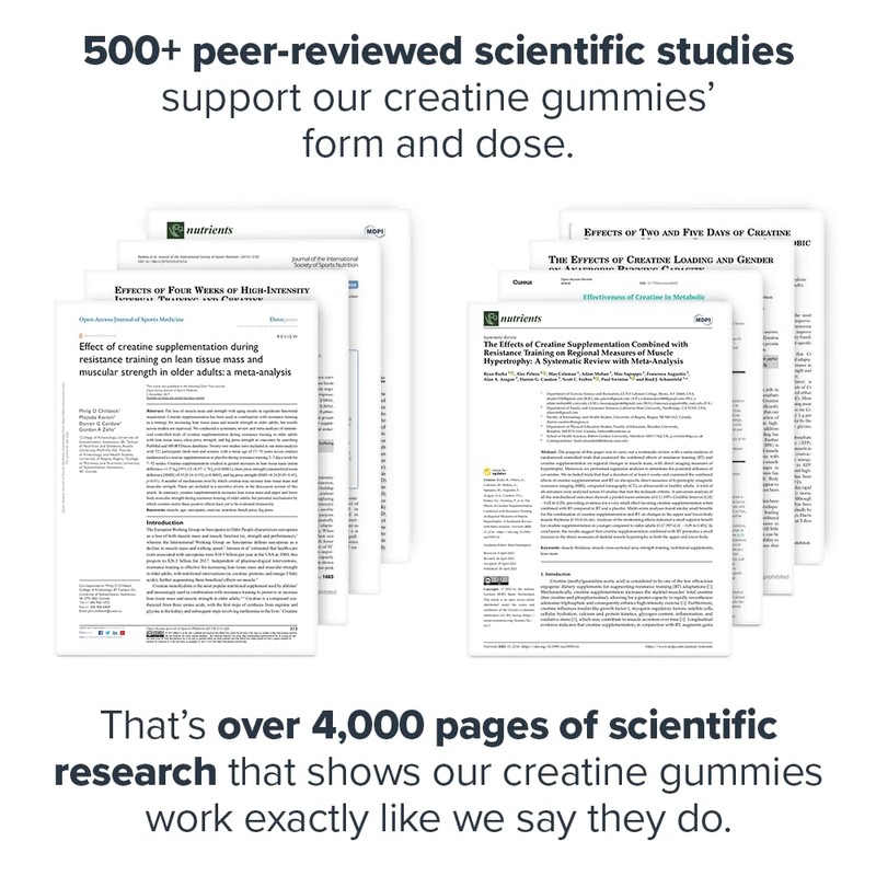 - 19 peer-reviewed scientific studies support our creatine gummies’ form and dose. That’s 191 pages of scientific research that shows our chewable creatine gummies work exactly like we say they do.