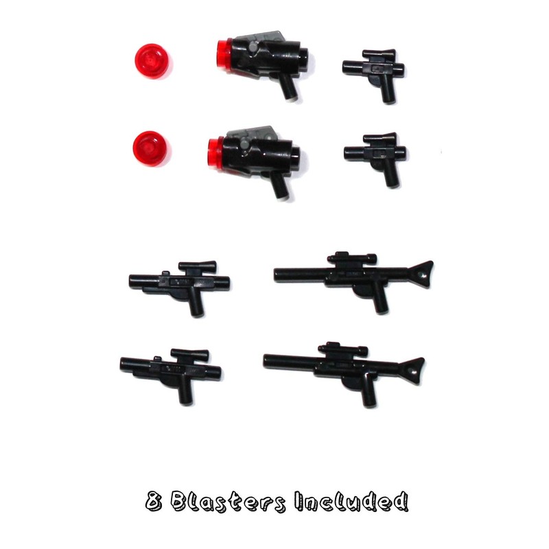 - INCLUDED - 8 Lightsabers (1 Kylo Ren LightSaber), 8 Blasters, ,1 Display Stand, Black Hood, Space Binoculars, 2 Lightning Bolts, Detonator Piece, and Cool Minifigureland Tile.