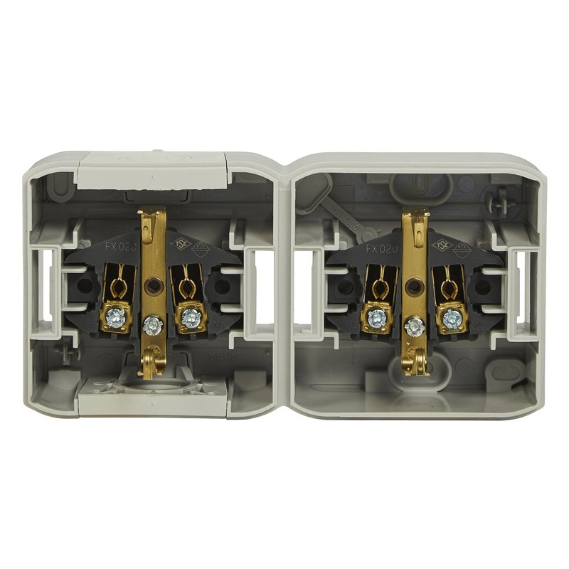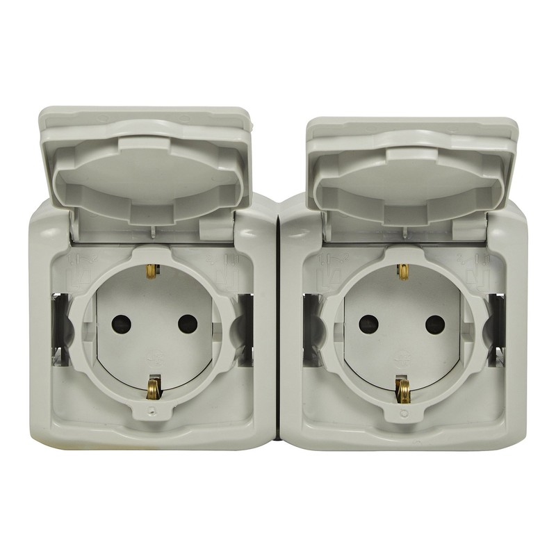 - 2-way wet room surface-mounted socket with lid, horizontal, 2-pin with protective contact, for the nominal voltage of 250 V and a rated current of 16 A