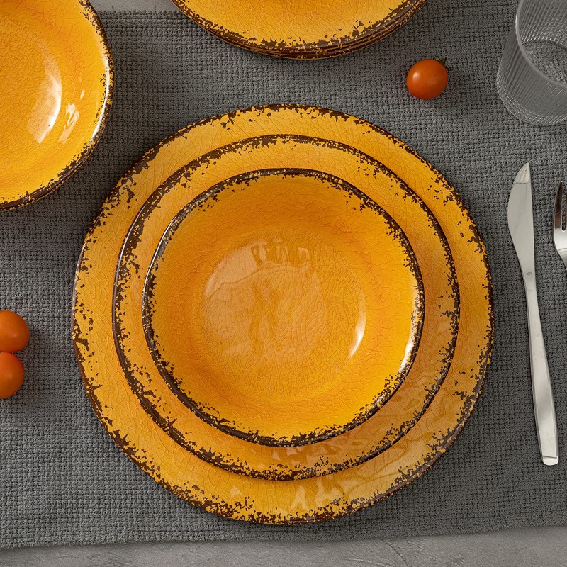 - MELAMINE DINNERWARE SETS: Designed with crackle glazed decor and organic rustic rim shape, the high-quality melamine material provides a good feel, plates deep enough for salad, steak, pizza, pasta, dessert, and bowl great for soup, cereal, fruits and snacks