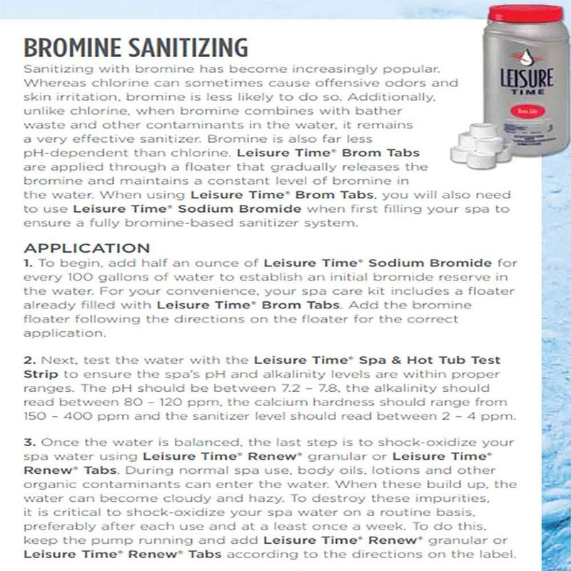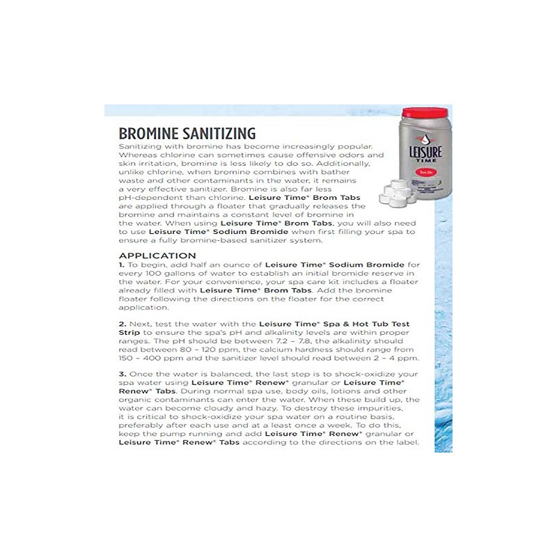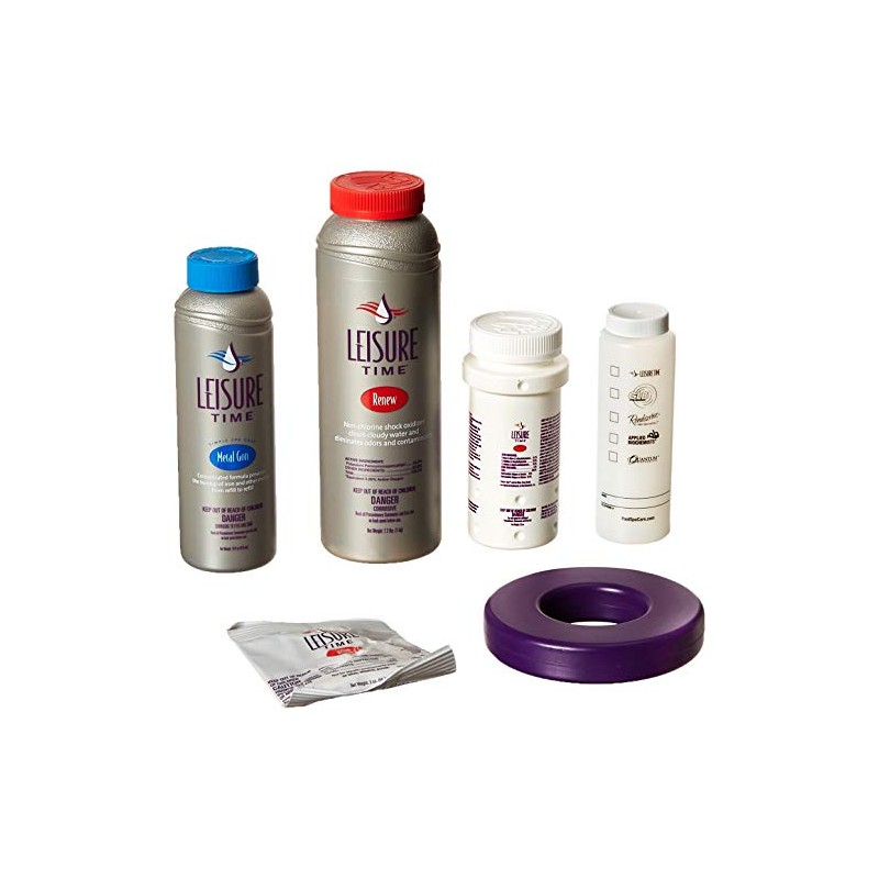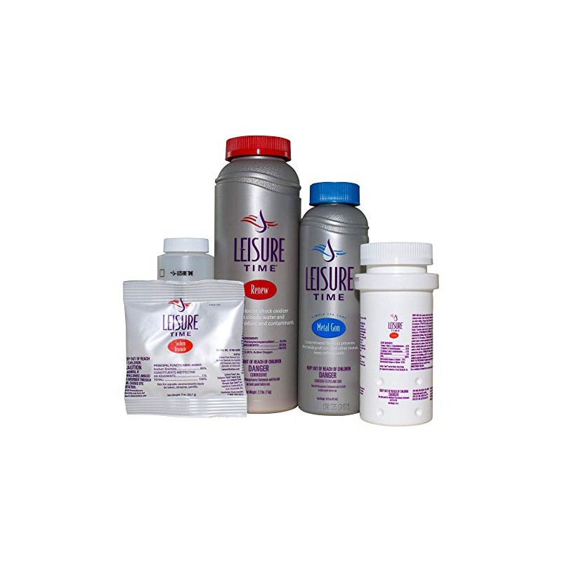 - INCLUDES: 3.5-ounce Leisure Time Brom Tabs, 2-ounce Leisure Time Sodium Bromide, 16-ounce Leisure Time Metal Gon, 2.2-pounds Leisure Time Renew, and water sample bottle