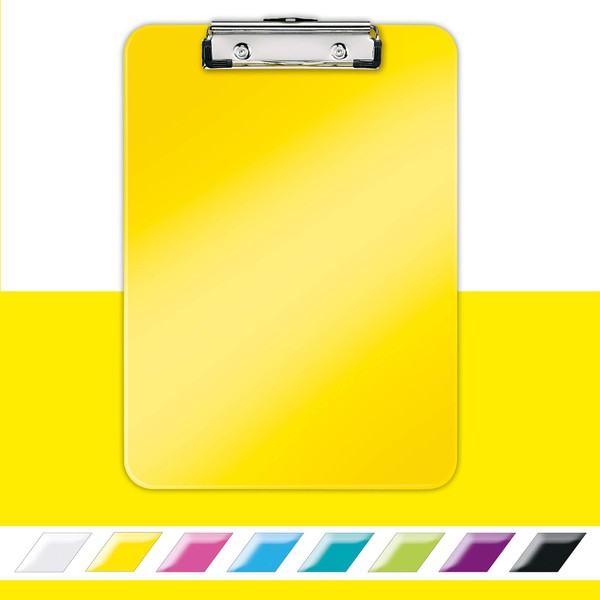 Yellow clipboard with a glossy finish, contemporary design with round edges, holds up to 80 A4 sheets, easy to handle ergonomic shape, for home and office use - Strong metal clip with rubber grip on top holds and secures papers, easy to transport loose documents on the move, space efficient storage: Retractable hook for hanging on walls or bulletin boards - Brighten up your desk with this and other products from the Leitz WOW range - High-quality plastic for an elegant look that lasts, easy to clean, smooth surface - Contents: 1 x Leitz A4 Clipboard, dimensions: (W x H x D) 228 x 17 x 320 mm, colour: yellow, WOW range, 39710016