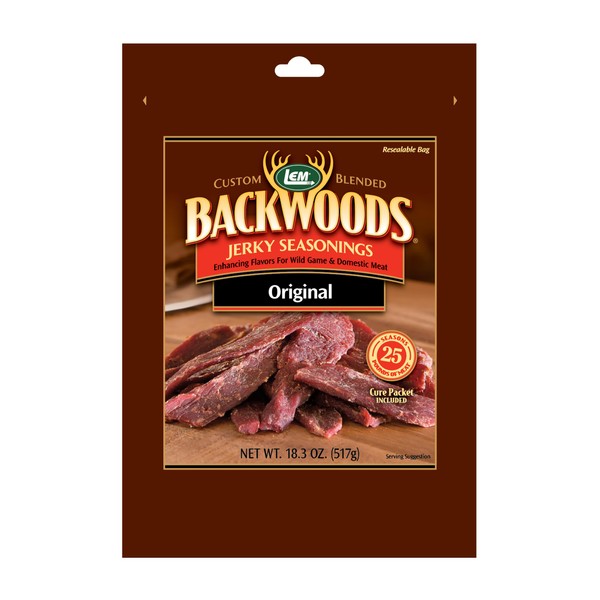 LEM Products Backwoods Original Jerky Seasoning, Ideal for Wild Game and Domestic Meat, Seasons Up to 25 Pounds of Meat, 18.3 Ounce Packet with Pre-Measured Cure Packet Included