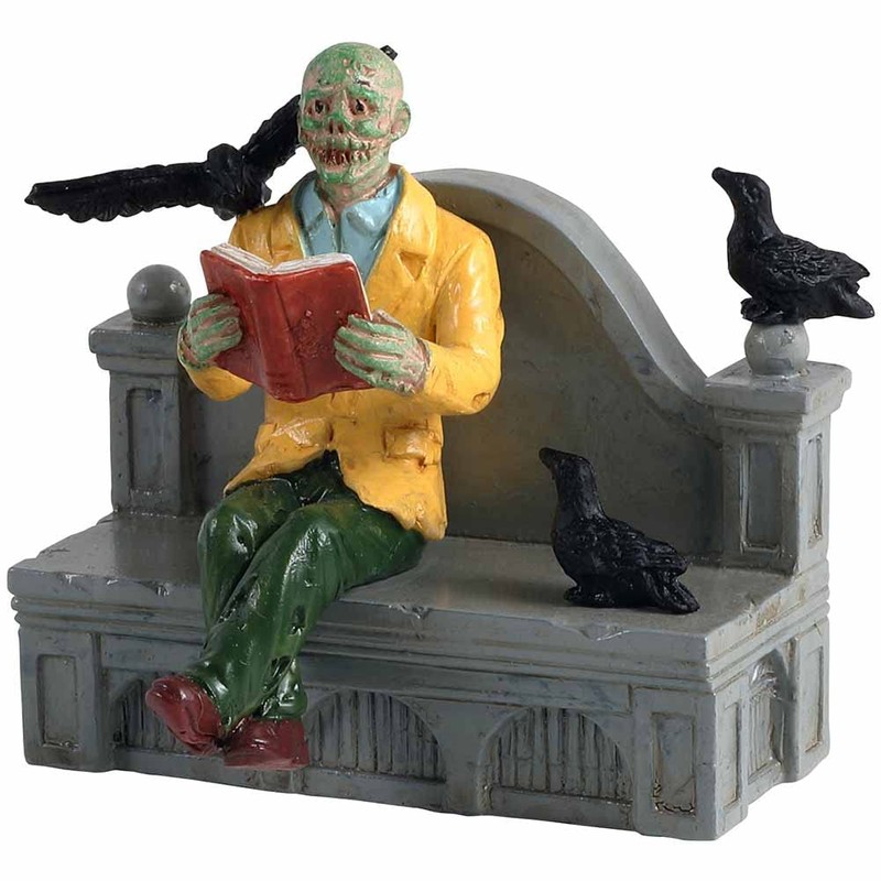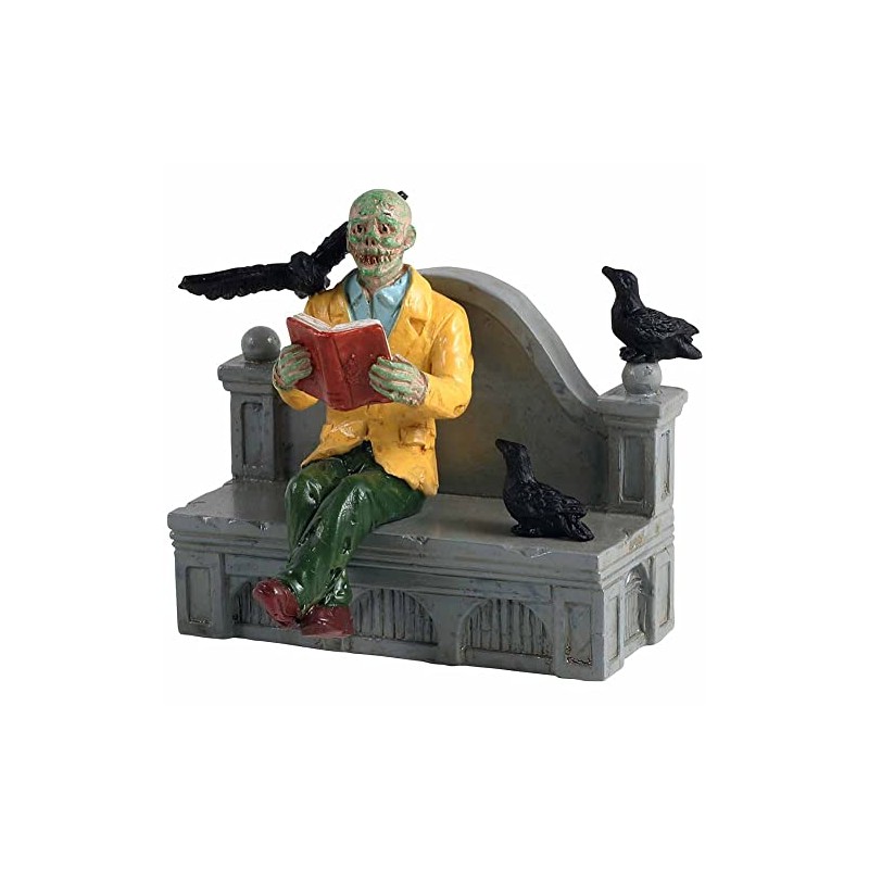 LEMAX Collection Scary City Reading in Peace LEMAX #12006 Reading in Peace is not always so easy. This green monster has his legs crossed as he tries to read one of his favorite horror novels. But not the only one on this stone bench. There are three annoying crows that disturb him. One crow sits on his shoulder while the other two watch him. I think they love this book. Approx. Measures 2.1" H x 2.3" W x 1.65" D. 5.3 x 5.8 x 4.2 cm. Year Published:2021 Made from: polyresin. Product Type: Figures