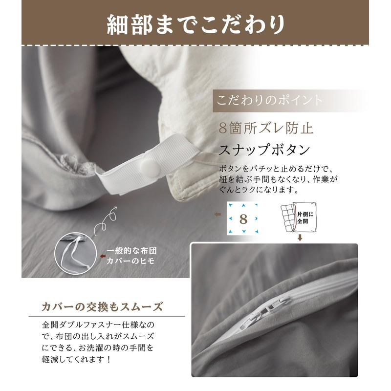 The futon closure uses a snap button so you can easily snap it on, so you can quickly shorten the time it takes for replacement. 8 snap buttons for secure fit Simply snap the button down to eliminate the hassle of tying the ties, making it easy to put on and take off. The double zipper design allows you to open and close it from either the right or left side. The full-opening zipper type allows for smooth insertion and removal to reduce the hassle of washing.