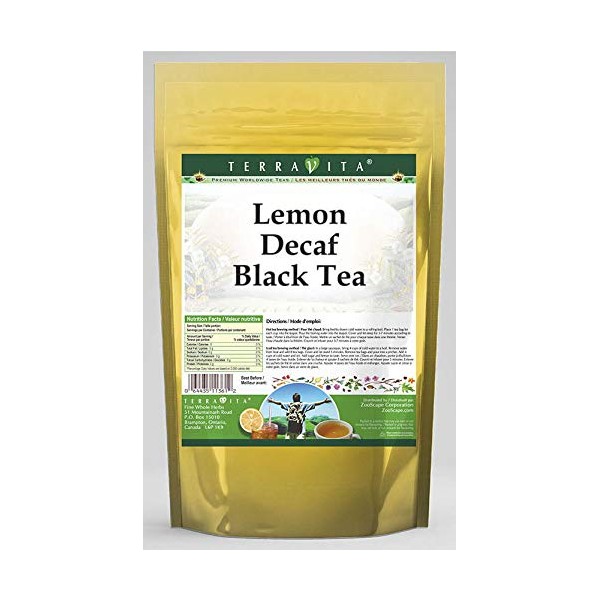 Our Lemon Decaf Black Tea is a wonderful flavored decaffeinated Black tea with Lemon Peel that you will enjoy the simple and elegant taste of! - Ingredients: Decaf Black tea, Lemon Peel and natural lemon flavor. - Hot tea brewing method: Bring freshly drawn cold water to a rolling boil. Place 1 teabag for each desired cup into the teapot. Pour the boiling water into the pot, cover and let steep for 2-4 minutes. Pour into your cup; add milk and natural sweeteners to taste. - Iced tea brewing method: (to make 1 liter/quart): Place 5 teabags into a teapot or heat resistant pitcher. Pour 1 1/4 cups of freshly boiled water over the teabags. Steep for 5 minutes. Quarter fill a serving pitcher with cold water. Pour the tea into the serving pitcher. Add ice and top-up with cold water. Garnish and sweeten to taste. - TerraVita is an exclusive line of premium-quality, natural source products that use only the finest, purest and most potent ingredients found around the world. TerraVita is hallmarked by the highest possible standards of purity, potency, stability and freshness. All of our products are prepared with the highest elements of quality control, from raw materials through the entire manufacturing process, up to and including the moment that the bottles or bags are sealed for freshness and shipped out to you. Our highest possible standards are certified by independent laboratories and backed by our personal guarantee. - TerraVita exists to meet and ensure your family's health and wellness without the harmful effects or chemicals and prescription medications. We strive to make all of our products affordable and reliable and are constantly searching the market to maintain our affordability and to look for new ways to serve you and the ones you love. TerraVita has become a
