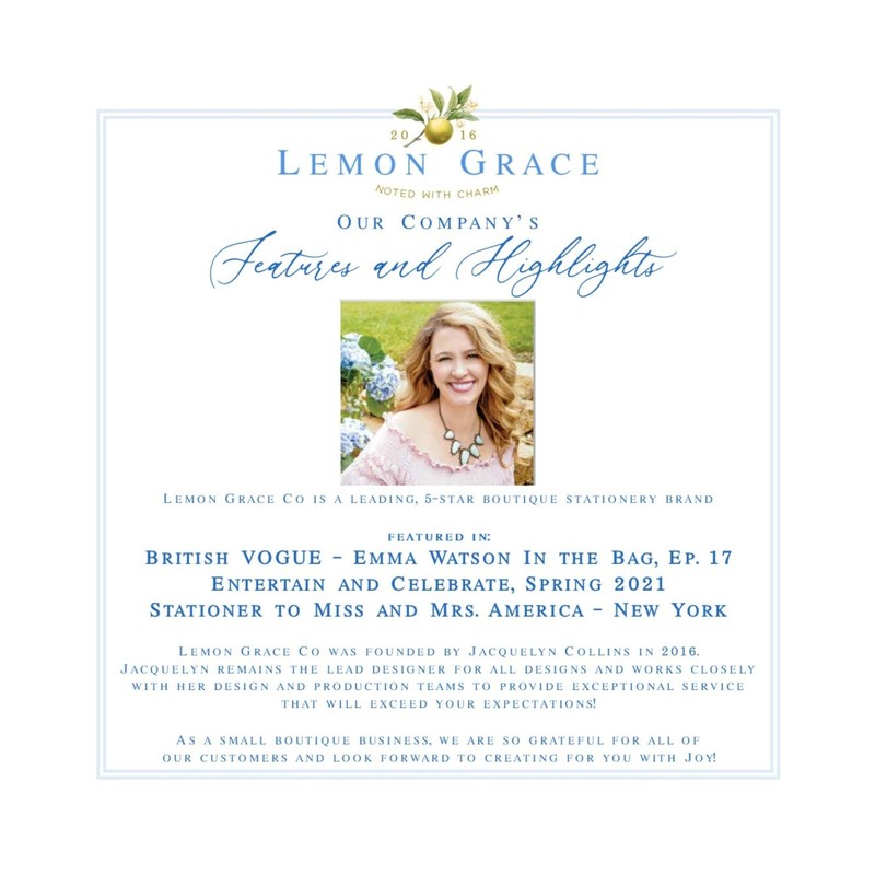 - COMPANY GUARANTEE - Lemon Grace Co is a leading small stationery company, offering one-of-a-kind, classic designs that have been featured in British Vogue Emma Watson: In The Bag | Episode 17 and Entertain and Celebrate Magazine. Our team works diligently to ensure order accuracy and quality. If for any reason, you are not satisfied, please reach out to us and we will go above and beyond to make it right!