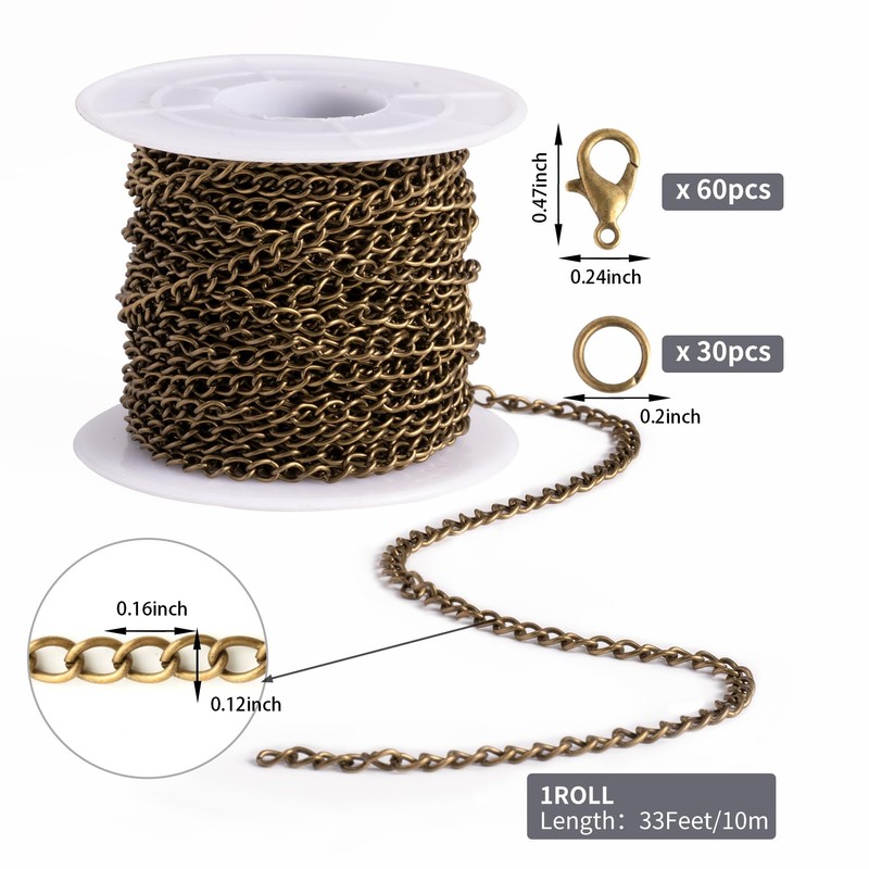 - Package Includes:You will get 33feet chains Roll,30pcs lobster clasps and 60pcs jump rings,the necklace chains are made of good quality iron.It is convenient to use these together with chain for your bracelet necklace pendant crafting.