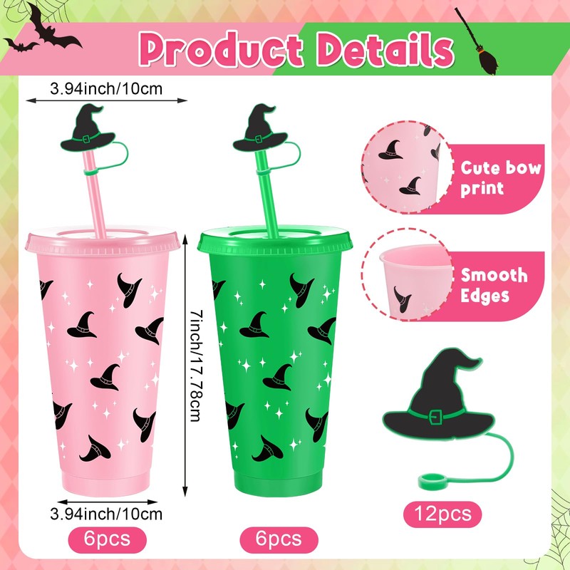 - Comprehensive Set: it comes with 12 sets of witch themed party favors, includes 12 pieces of plastic pink and green tumblers with lids and straws, 12 pieces witch hat straw covers, enough quantity and comrehensive set to meet needs for parties and gatherings