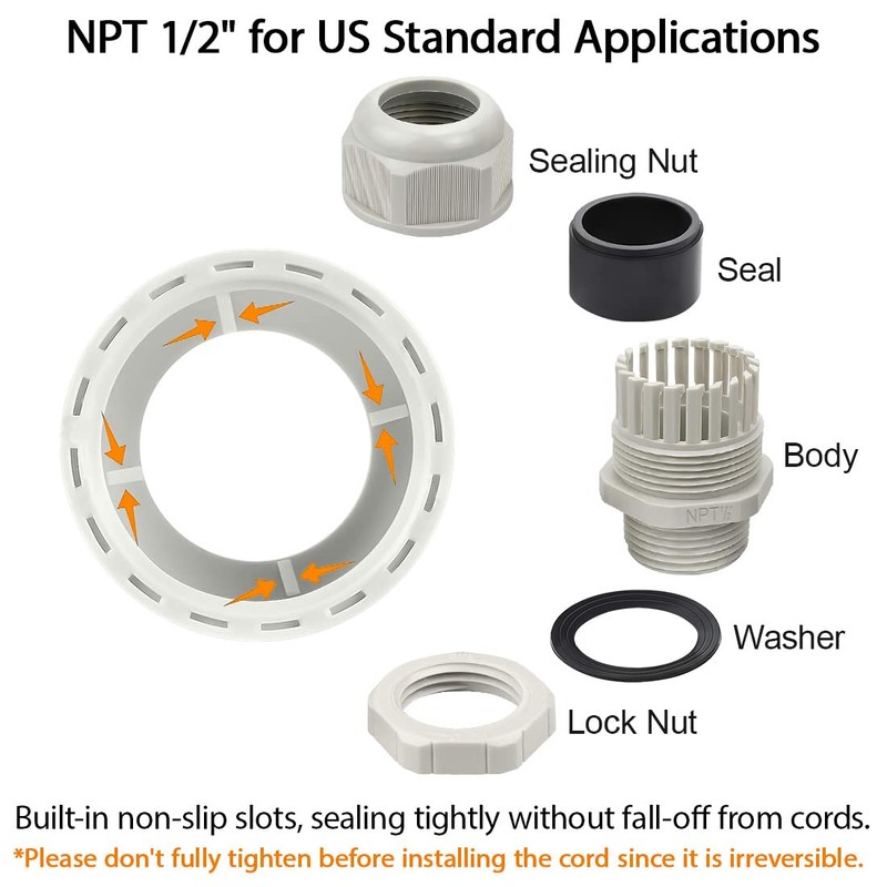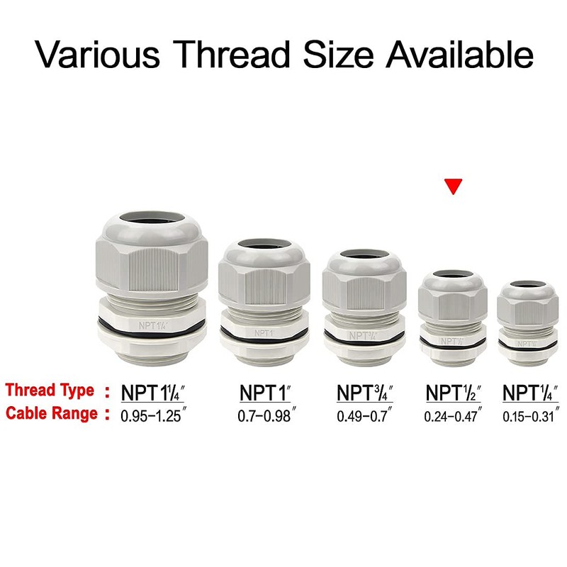 • Valuable quantity: Cable glands kit has NPT 1/2" 5 packs in total. Adjustable range strain relief to cables and wires connecting to electrical equipment.