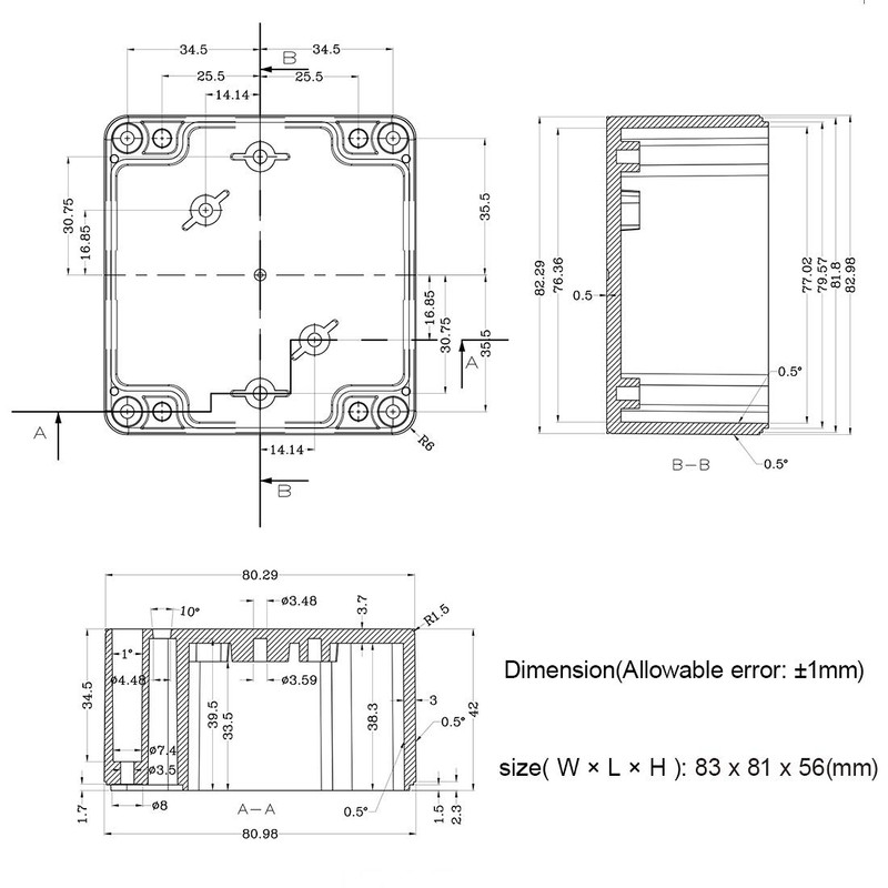 - External Size of the project box : 3.29" x 3.19" x 2.2"/83x 81 x56mm(L*W*H) ,Internal Size of the project box : 3.1" x 3" x 2"/76 x 74 x 49mm(L*W*H)- - *Tips: in order to confirm the detailed installation dimensions, please refer to our detail image, which shows specific internal dimensions of the product. (Allowable Error: 2mm) ,Thickness: 0.12in/3mm