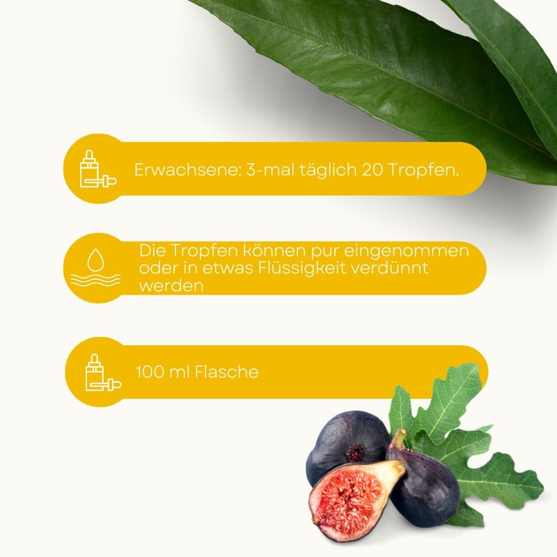 • Ingredients: fructose, water, fig buds (Ficus carica L.) 33% Instructions for use: Adults 20 drops 3 times a day. The drops can be taken directly into the mouth or diluted in a little liquid