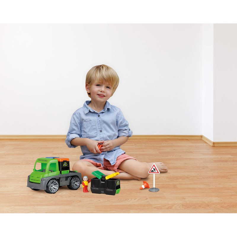 Lena 04453 - Truxx Recycling Truck Müllwagen, Müllfahrzeug ca. 26 cm, robuster Müll LKW, Müllauto mit Funktion, 2 Doppel Mülltonnen und vollbeweglicher Lena Spielfigur, für Kinder ab 2 Jahre, grün