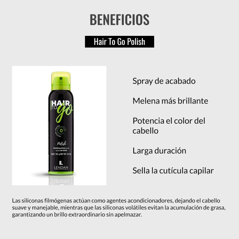 - HAIR SHINE SPRAY: Polish Shine Spray gives hair an instant and spectacular long-lasting shine. Additionally, it helps seals the hair cuticle, protecting the hair from external aggressions and highlighting tones and color reflections.
