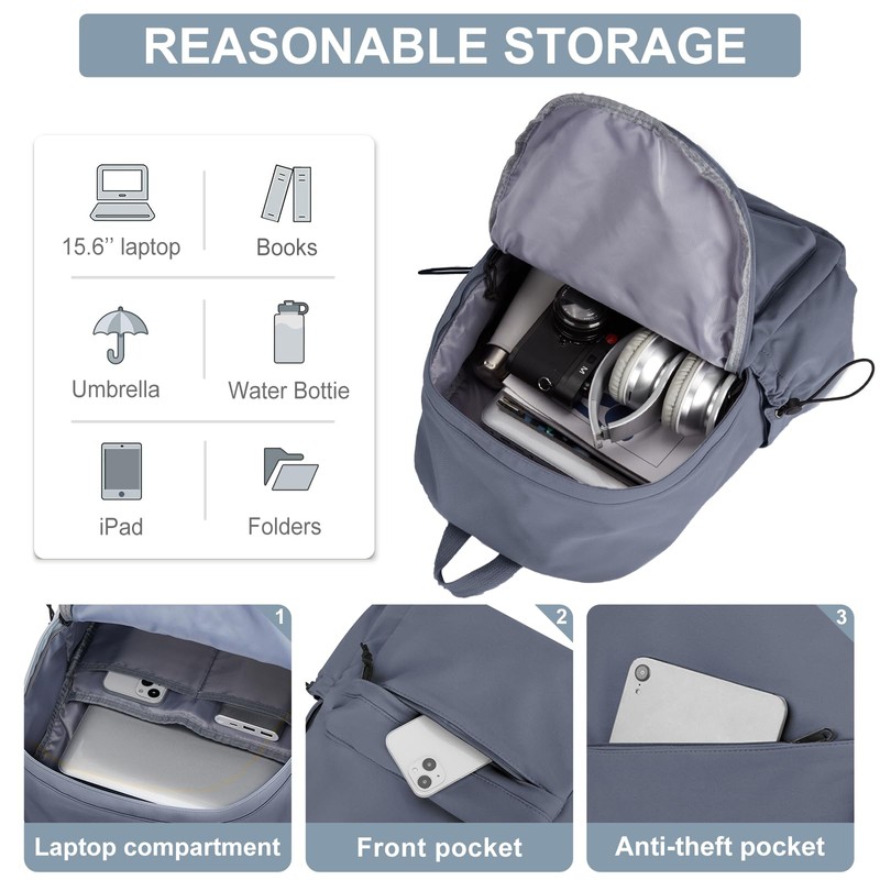 - Múltiples bolsillos de almaceniento: esta mochila negra cuenta con múltiples bolsillos y compartimentos, incluyendo una bolsa con cierre, una bolsa frontal con cierre, dos bolsas laterales con cordón y una bolsa antirrobo. Los bolsillos laterales pueden contener botellas de agua y guas.