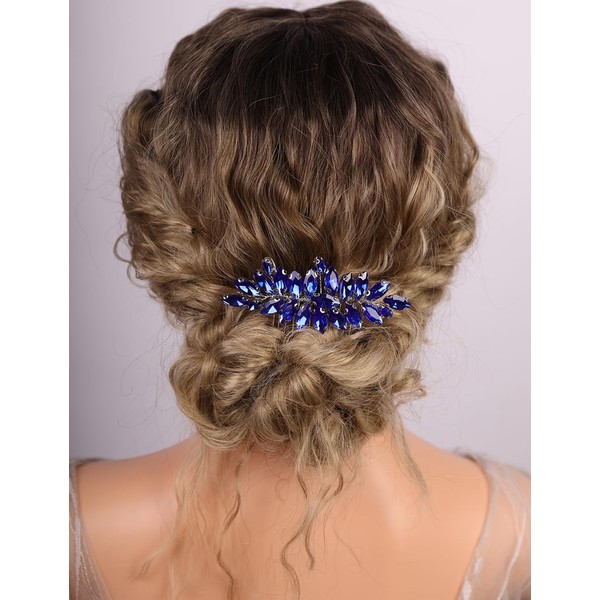 Lenjicons Sparkling Blue Rhinestone Hair Comb Silver Wedding Hair Accessories Handmade Rhinestone Headpiece Teardrop Rhinestones Hairpiece for Wedding Women (blue)