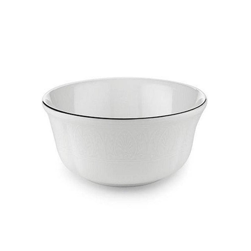 A monochromatic white palmetto pattern hugs the sides of the Hannah Platinum All-Purpose Bowl. Trimmed in precious platinum, this dishwasher-safe bowl is made from crisp white durable bone china, and adds a fresh sophistication to any soup or salad.