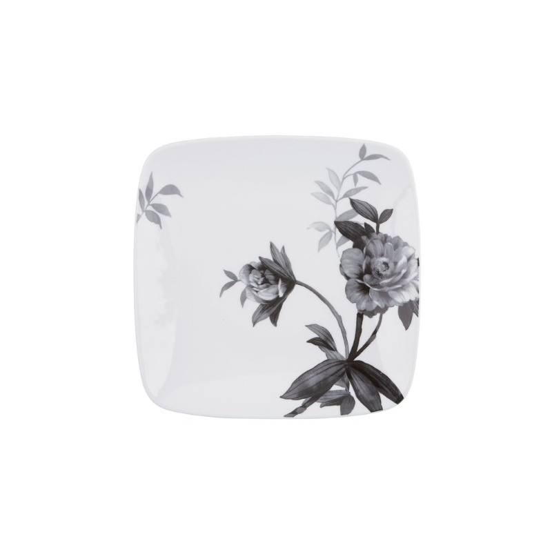 - Square white bodied dinner plate with charcoal and black flowers