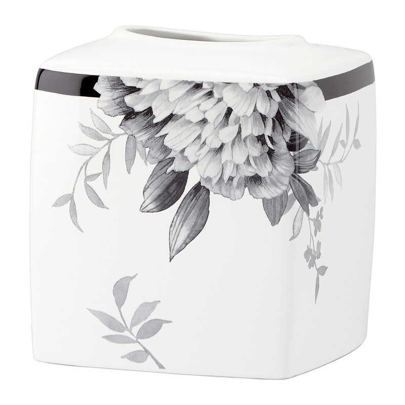 With this tissue holder, every time you reach for a tissue, you'll be reminded of its exquisite beauty. Dramatic floral artistry drapes down from the edge of the holder, overlaying the wide black band and continuing onto the white background below. Simply stunning.
