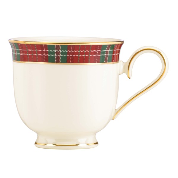 Ornate 24-karat gold accents contrast a playful Christmas plaid on this warm and festive ivory bone china tea cup. It is ideal for serving holiday guests coffee, tea, and more after dinner.