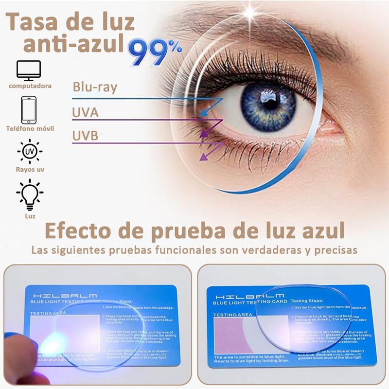 - Gafas de Filtro de Luz Azul: Estas gafas tienen un excelente efecto anti-luz azul y pueden filtrar eficazmente el 99% de la luz dañina, proteger sus ojos de la luz azul y los rayos ultravioleta y evitar que los rayos ultravioleta aceleren el envejecimiento ocular y causen miopía o cataratas. Al mismo tiempo también puede aliviar la fatiga ocular y reducir la presión en la cabeza.