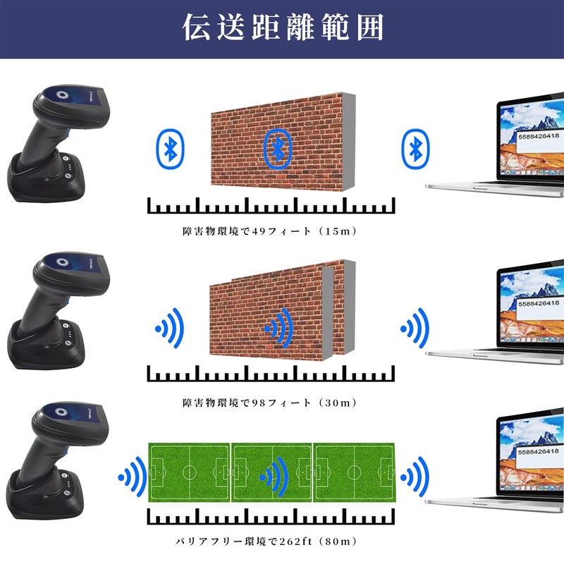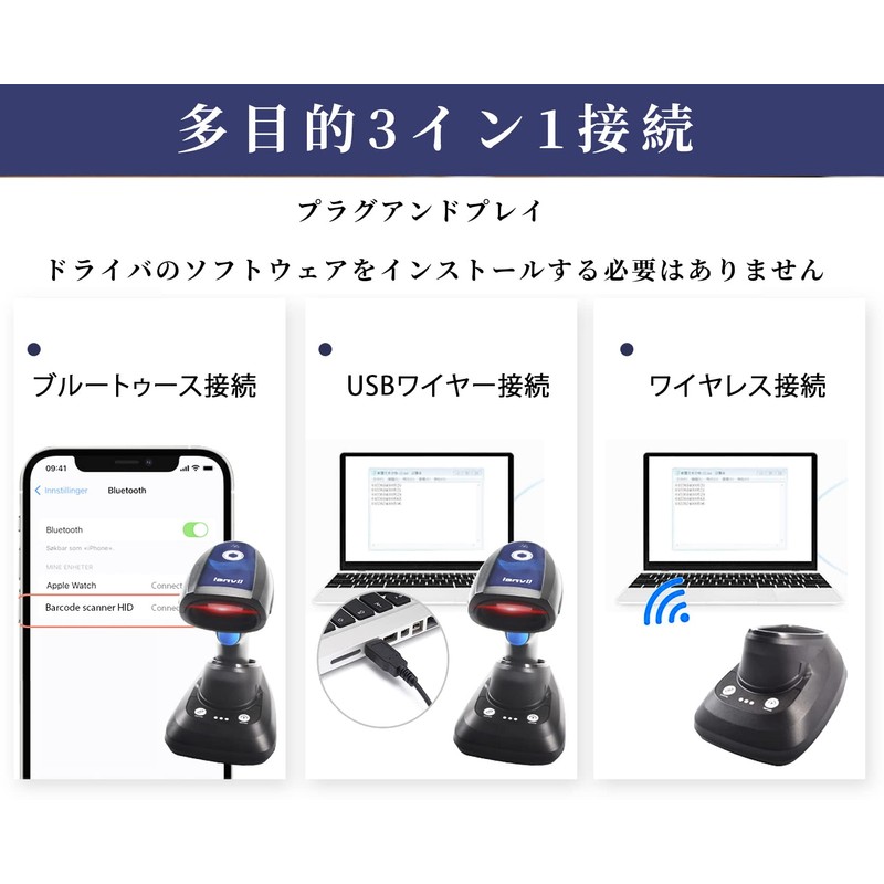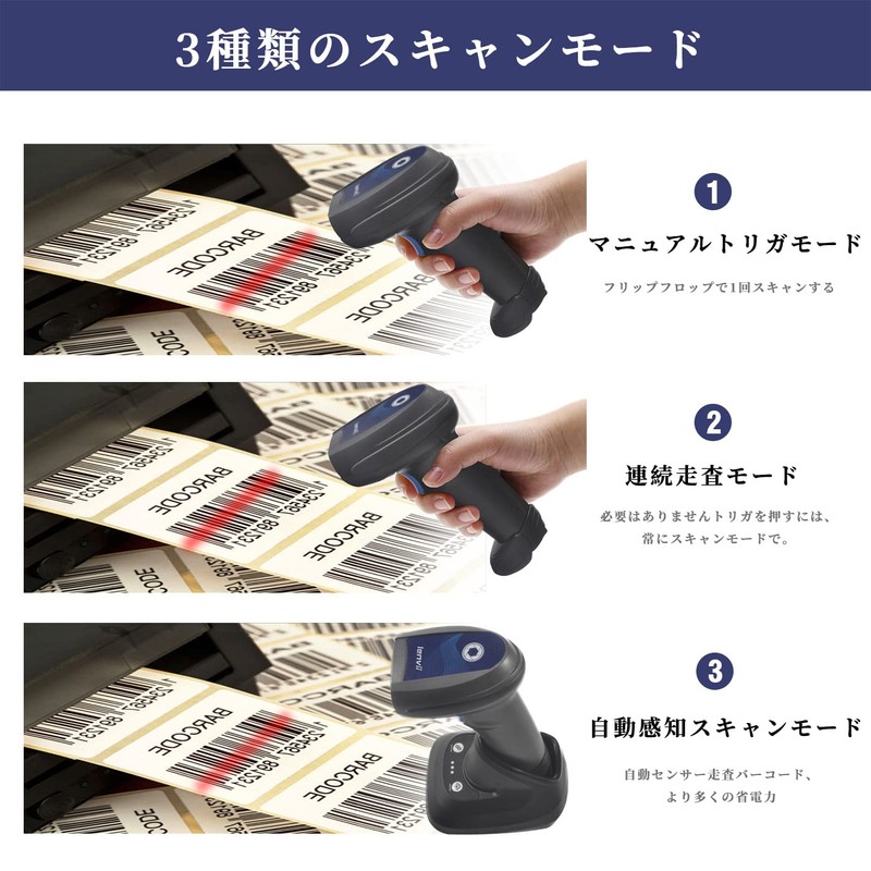 - 【3-in-1 Connection】The wireless barcode scanner supports a variety of connection options, such as USB wired connection, 2.4G wireless connection, and Bluetooth connection. Easy to connect with your laptop, PC, mobile phone, tablet. Compatible with Windows XP/7/8/10, Mac OS, Windows Mobile, Android OS, and IOS and integrate seamlessly into any setup