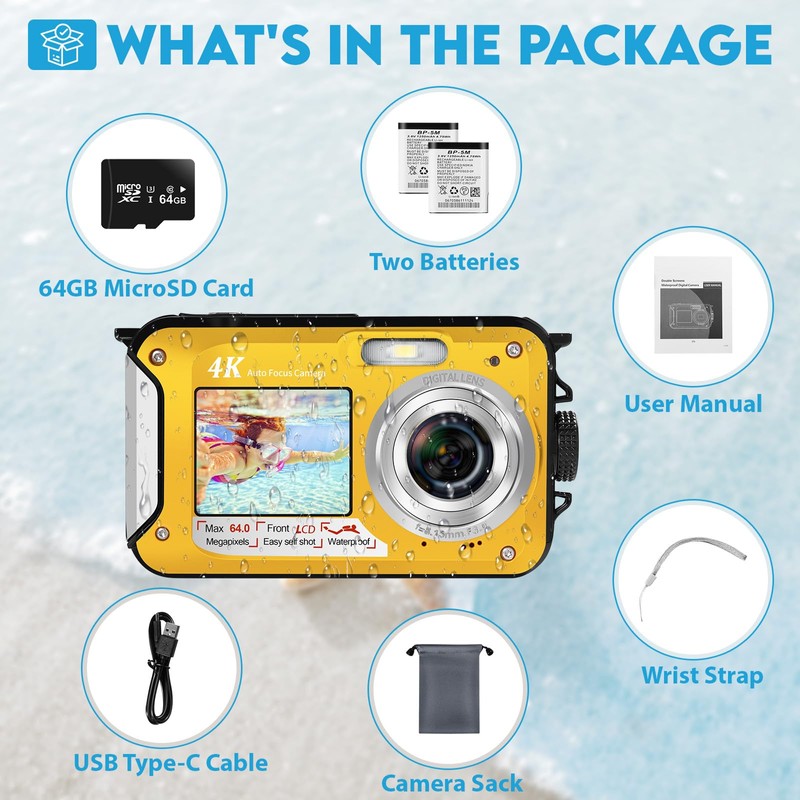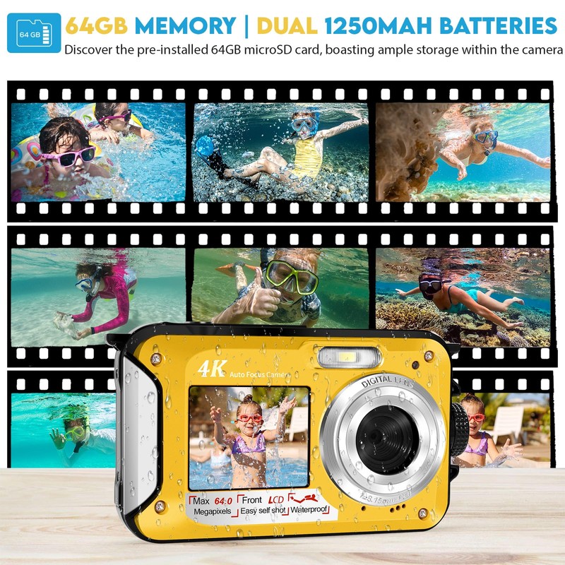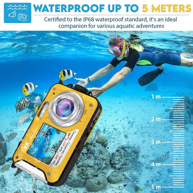 - 64 MP Unterwasserkamera mit 64 GB Speicherkarte, 4K Unterwasserkamera mit Autofokus und Doppelbildschirm HD Selfie, 5 Meter Digitale Unterwasserkamera (2 Batterien)