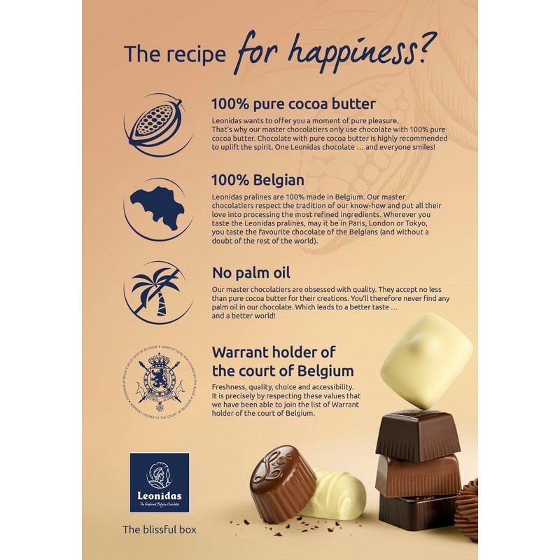 - Enjoy an assortment of our finest dark, milk, and white chocolates, pralines, caramels, butter creams, and ganaches. If you’ve never experienced Leonidas chocolates, this collection will introduce you to the rich, luxurious taste that has made us a favorite worldwide. With a variety of flavors in one box, it's perfect for those who love to explore different chocolate types without getting bored.