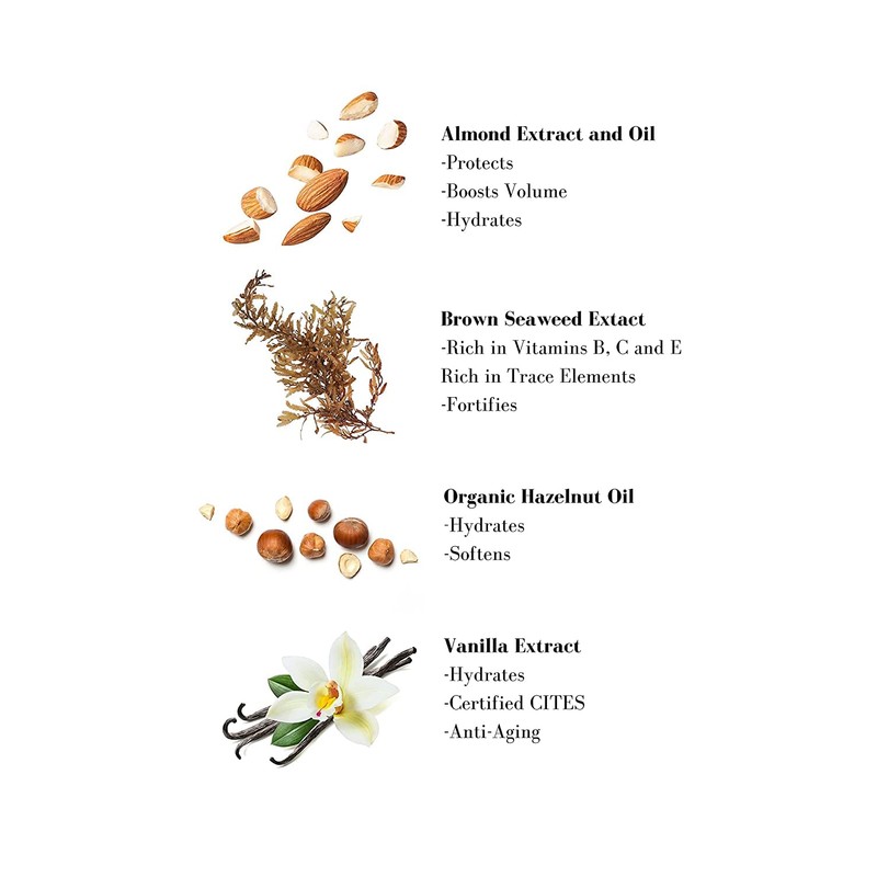 Vegetable oils, silk proteins, algae extract and UVA/UVB filter.