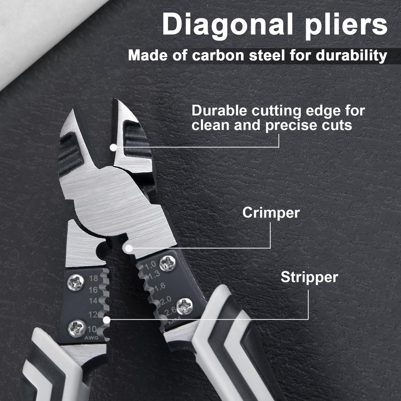 - MULTI-FUNCTIONAL: Pliers with 3 in 1 wire cutter, wire stripping, terminal crimp all in one The edge of the blade is 60-62 hrc. Maximum Cutting Diameter: 1.6mm Iron Wire Wire Stripping: Suitable for 18-10 awg (1.0-2.6mm) wire and can be easily stripped without damaging the wire core. Crimping Sheath: 2.5mm² / 4mm² 2 min/long