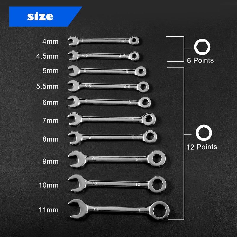 - Package : Size: 4mm, 4.5mm, 5mm, 5.5mm, 6mm, 7mm, 8mm, 9mm, 10mm, 11mm. 10 pcs MET mini combination wrenches set with a metal hoop ring.