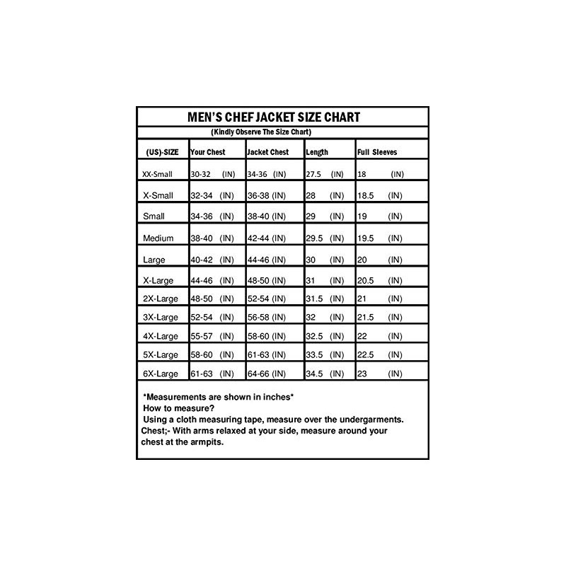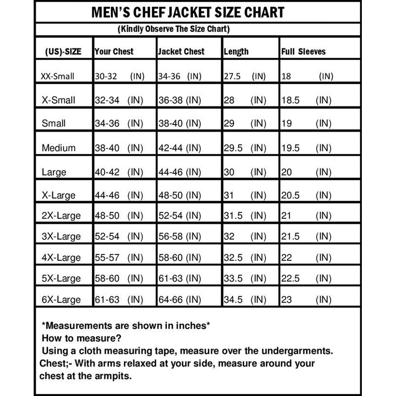 - Comfort to wear and easy to wash. We have given a size chart so that you may choose your correct size. We will provide you accurate size Chef Coat and We will be responsible for your accurate size Chef Jacket. This Chef Jacket is fully machine washable, can also be easily hand-washed and quick drying.