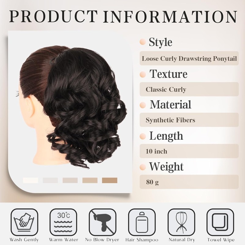 - Instant Volume and Length: This curly wavy dark brown ponytail is designed to instantly thicken your hair. 10 Inch drawstring ponytail is great for adding subtle length, wear it and you get a realistic and natural looking. Natural curly wavy texture and soft synthetic fibers, looks like human hair.