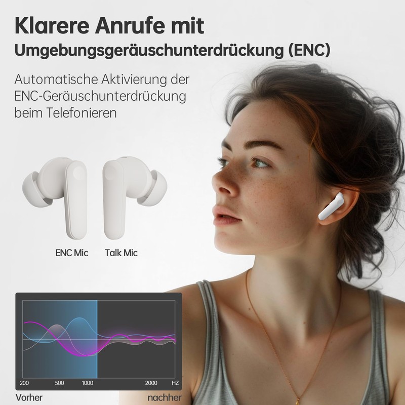 - Revolutionäre Geräuschunterdrückung ANC+ENC: Unsere Kopfhörer setzen einen neuen Maßstab in Sachen Geräuschunterdrückung durch die Integration von ANC und ENC-Technologien. Durch die Kombination dieser beiden innovativen Ansätze garantieren wir Ihnen unabhängig von Ihrer Umgebung ein unübertroffenes Klangerlebnis und ungestörte Gespräche. Mit unserer ENC-Technologie erreichen wir eine beeindruckende Reduzierung von bis zu 90% der Umgebungsgeräusche, was zu einer maximalen Senkung von über 45 dB führt.