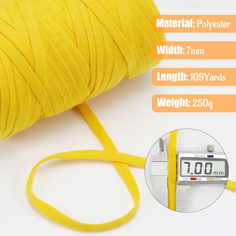 - Specifications: Weight: 250 g / 8.82 oz; Length: 100 m / 109 yards; Width: 7 mm, suitable for 5 mm - 6 mm crochet hooks. This t-shirt yarn is ideal for any crochet project.
