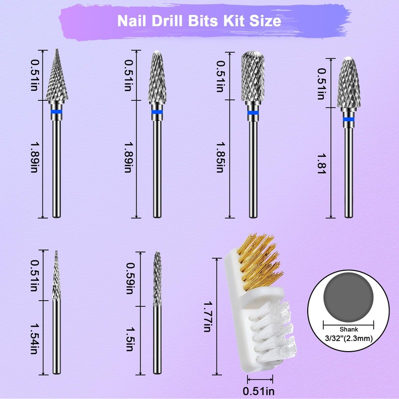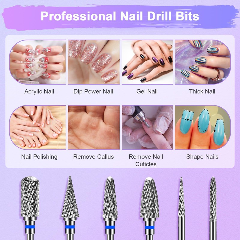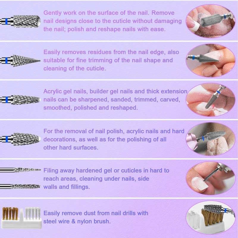 - High quality nail drill attachments: complete with 6 different shapes of carbide nail drills, this drill bits set meets all the needs of manicure pedicure, for various professional nail work such as carving, engraving, grinding, milling, sharpening, grinding, polishing, etc. This manicure drill is corrosion resistant and does not clog nails.