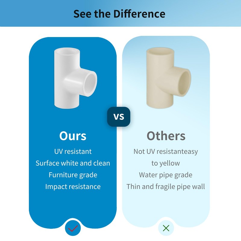 • Application: Furniture-Grade SCH40 Parts, 1/2inch suitable for indoor and outdoor use. Building any type of structure out of tee pvc pipe fittings, such as diy cat enclosure, shelves, pool products, chairs, desks, puppy play cube or puppy gym, garden supports structures and so on
