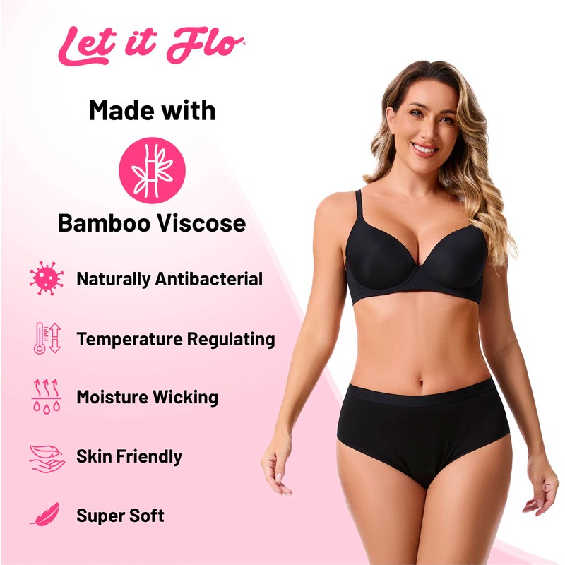 - Ultra-Soft Bamboo Viscose for All-Day Freshness: Made with 95% bamboo viscose and 5% elastane, these period panties are naturally breathable, temperature-regulating, and antibacterial. The silky-smooth fabric is gentle on sensitive skin, helping to reduce irritation, control odours, and wick away moisture. The absorbent gusset is built with layered protection for effective moisture control and hygiene. This eco-friendly material is kind to your skin and better for the planet.