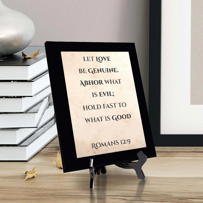 Let love be genuine. Abhor what is evil; hold fast to what is good. Romans 12:9, Black Frame 8x10 Decorative Wall Plaque | Elegant Bible Verse