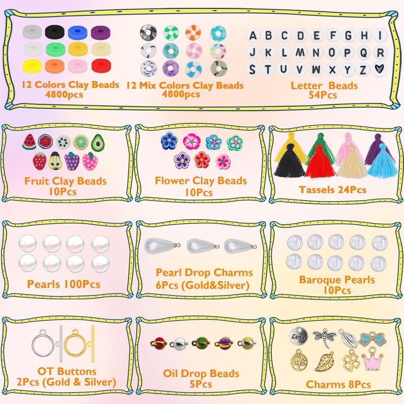 - [Jewelry Making Kit] This is a great set of clay beads, a good choice for a bracelet kit. DIY bead jewelry kits improve your creativity, imagination, concentration, and communication skills. The great crafting kit for all home crafting activities.