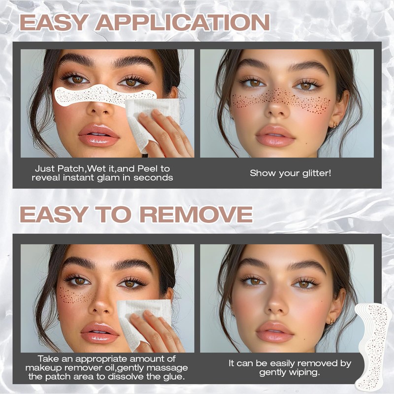 - 【Easy to Apply & Remove 】Remove the backing clear sheet by peeling it off;Apply the sticky side to your skin;Wet it,and Peel to reveal instant glam in seconds.Easy to get off with some makeup remover (oil).These sparkle freckles patches come off just like regular makeup,with no extra hassle