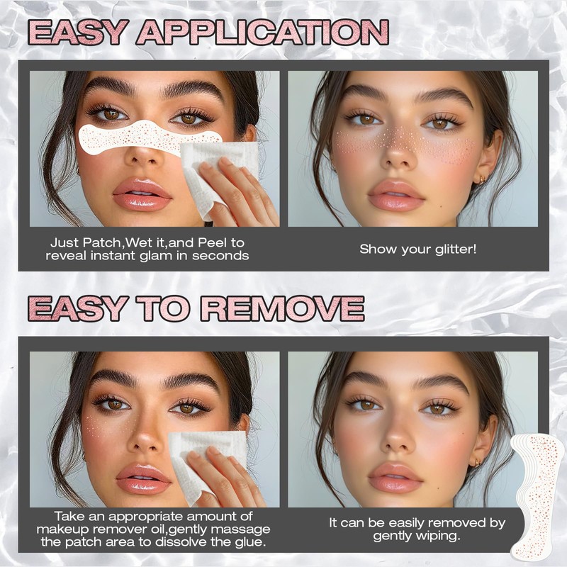 - 【Easy to Apply & Remove 】Remove the backing clear sheet by peeling it off;Apply the sticky side to your skin;Wet it,and Peel to reveal instant glam in seconds.Easy to get off with some makeup remover (oil).These sparkle freckles patches come off just like regular makeup,with no extra hassle