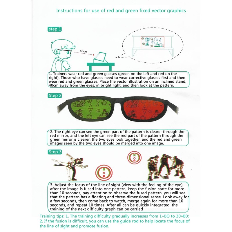 - This Tranaglyph card comes with red/green glasses and instructions and is designed to be used for at home therapy of your binocular vision problems.